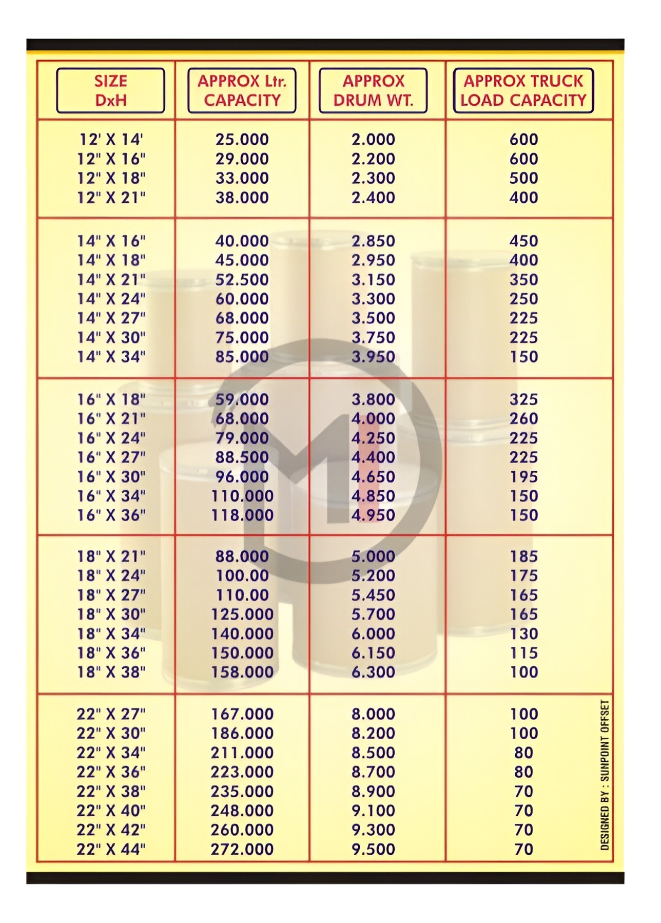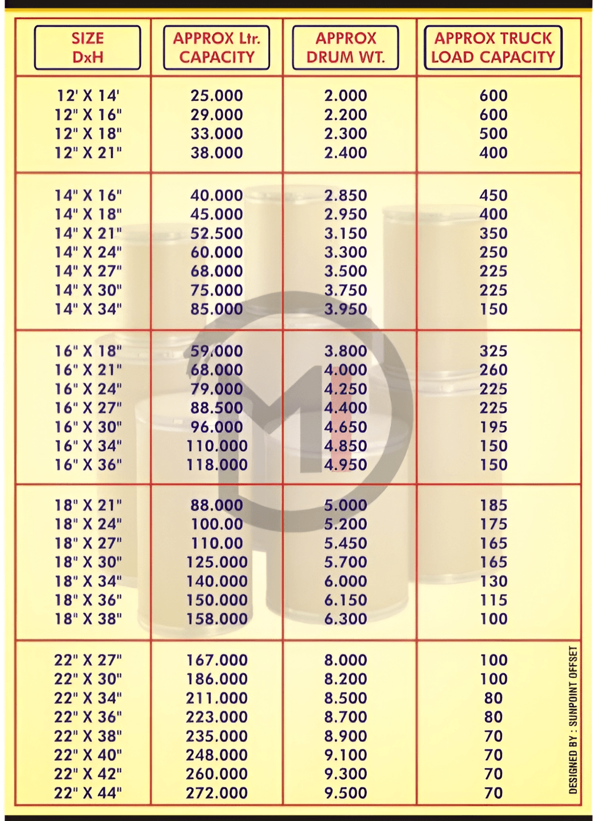 Find detailed specifications of Man Industries Paper Drums – sizes, capacities, weights, and truck load capacity. Durable, lightweight, and ideal for safe storage and transport.